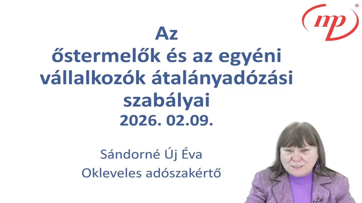 2026-ban az átalányadózás szabályai továbbra is széles körben alkalmazhatók az őstermelők és az egyéni vállalkozók számára, ugyanakkor a bevételi határok, a tevékenységi korlátok és az adminisztratív kötelezettségek pontos ismerete elengedhetetlen. A 2026. február 9-i szakmai napon Sándorné Új Éva a jogosultsági feltételek rendszerét, a bevétel fogalmának gyakorlati értelmezését, valamint az áttérés részleteit elemezte.